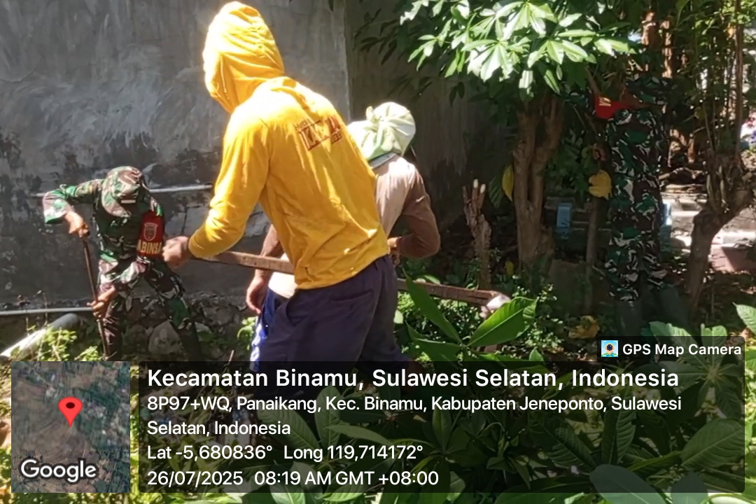 Jeneponto, Aliefmedia.co.id – Babinsa Koramil 01/Binamu Kodim 1425/Jeneponto, Sertu Alimuddin, memimpin langsung kegiatan kerja bakti bersama warga dalam upaya normalisasi saluran air di Lingkungan Bungung Baddo, Kelurahan Panaikang, Kecamatan Binamu, Kabupaten Jeneponto, Sabtu, 26/07/2025.