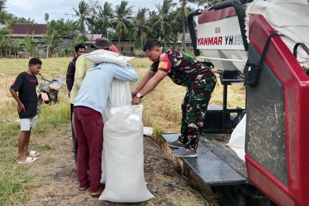 Dengan menggunakan mesin pemanen modern, para petani dibantu Babinsa memindahkan gabah ke dalam karung sebelum dibawa ke tempat penjemuran.