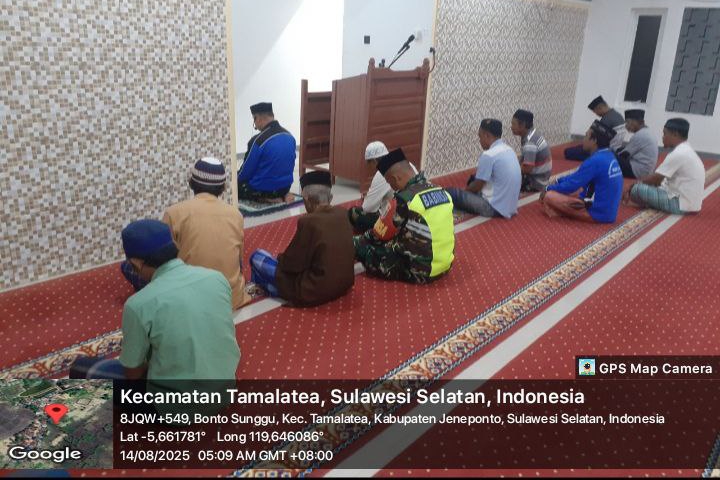 Jeneponto, Aliefmedia.co.id – Dalam upaya mempererat silaturahmi dan membangun semangat kebersamaan, Babinsa Koramil 03/Tamalatea Kodim 1425/Jeneponto, Serda Ramli, melaksanakan sholat Subuh berjamaah bersama warga di masjid wilayah binaannya, Desa Bontosunggu, Kecamatan Tamalatea, Kabupaten Jeneponto, Kamis, 14/08/2025.