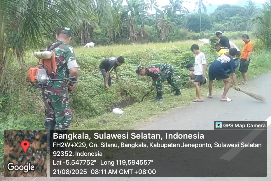 Jeneponto, Aliefmedia.co.id – Babinsa Koramil 02/Bangkala Kodim 1425/Jeneponto kembali menunjukkan kepedulian terhadap kebersihan lingkungan dengan menggelar kerja bakti bersama masyarakat binaannya di Dusun Munumen 45, Desa Gunung Silanu, Kecamatan Bangkala. Kamis, 21/08/2025.