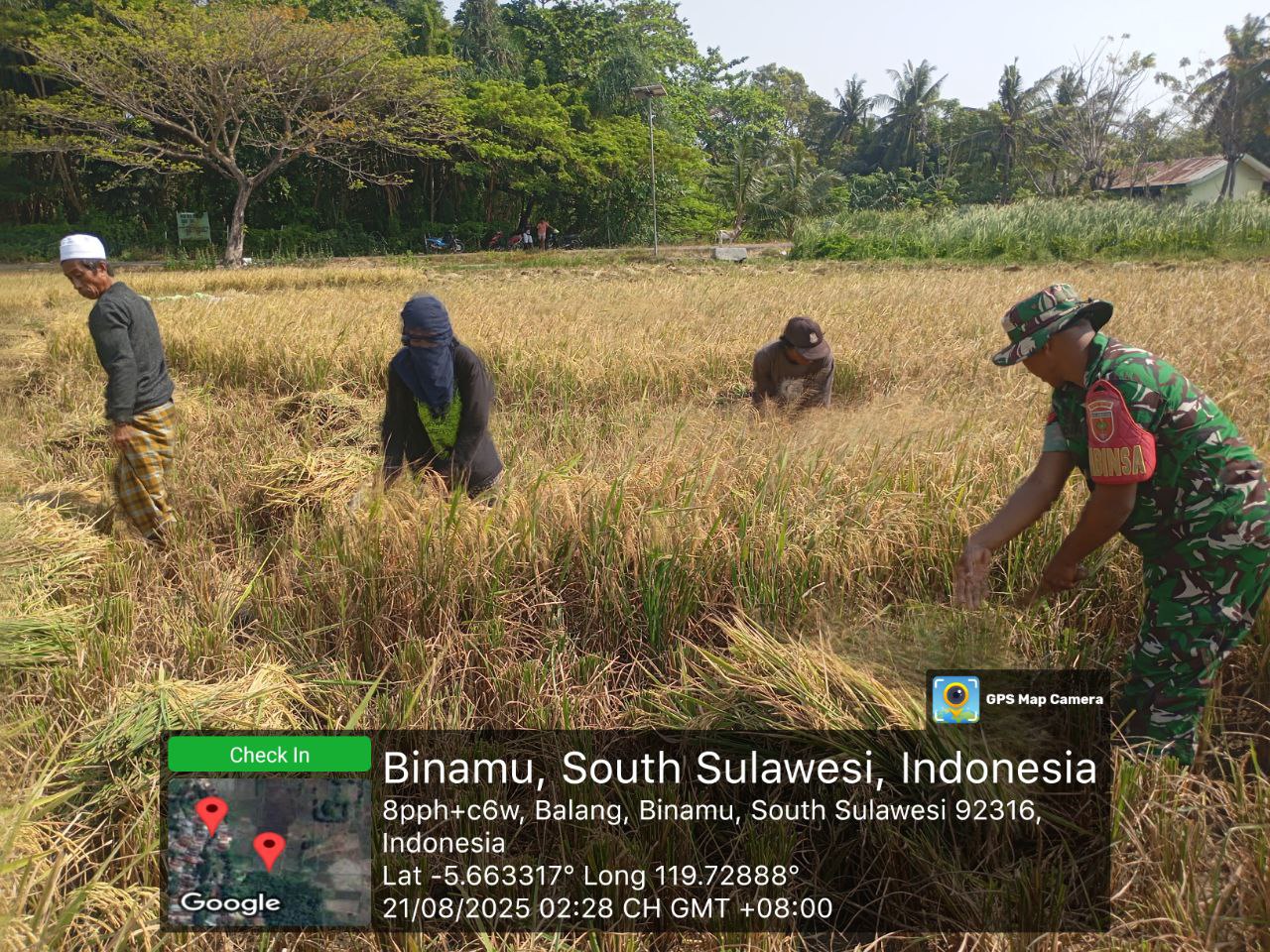 Babinsa Koramil 01/Binamu Kodim 1425/Jeneponto, Koptu Abidin, ikut turun langsung ke sawah membantu petani saat panen padi. Dengan semangat gotong royong, Babinsa bersama warga saling bahu-membahu memotong padi yang telah menguning siap panen.