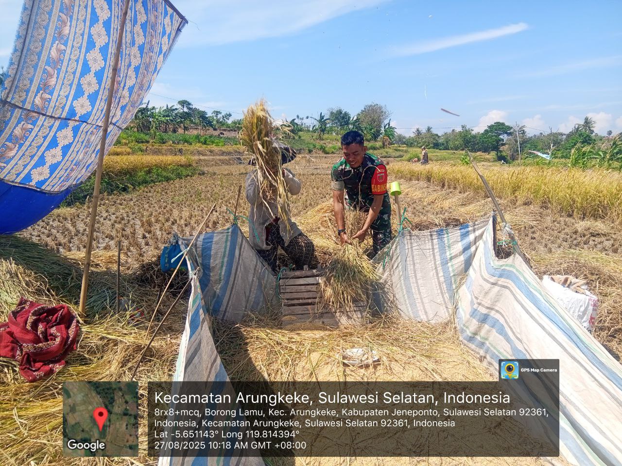 Jeneponto, Aliefmedia.co.id – Wujud nyata kepedulian TNI kepada masyarakat kembali terlihat ketika Babinsa Koramil 05/Batang Kodim 1425/Jeneponto, Serda Muh. Ilyas, turun langsung mendampingi petani dalam proses panen padi di Desa Boronglamu, Kecamatan Arungkeke, Kabupaten Jeneponto, Rabu, 27/08/2025.