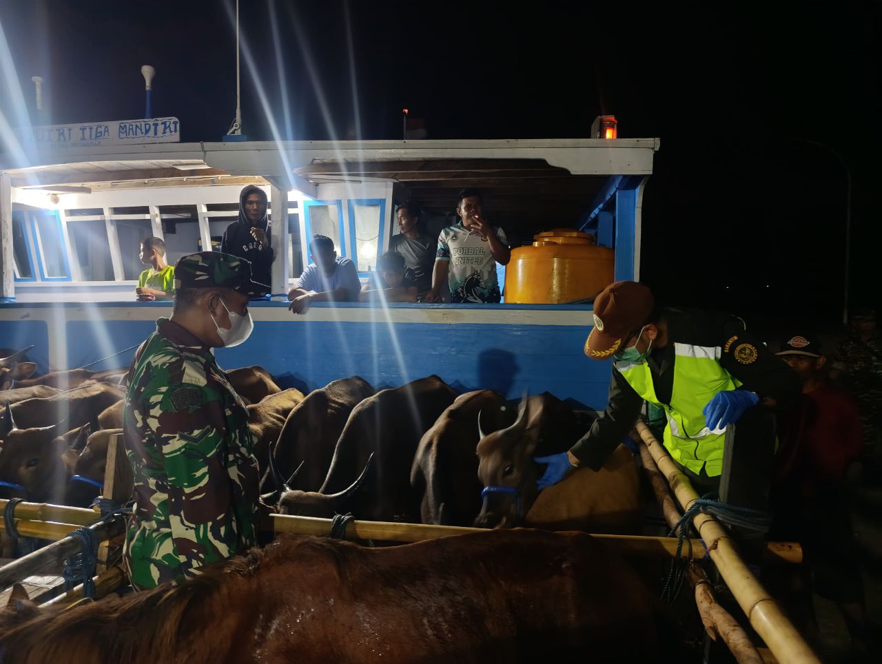 Jeneponto, Aliefmedia.co.id – Babinsa Koramil 1425-05/Batang, Serka Ahmad dan Serda Baharuddin bersama instansi terkait tetap sigap melaksanakan pendampingan serta pengawasan terhadap hewan ternak yang masuk melalui jalur laut di Pelabuhan Bungeng, Kabupaten Jeneponto, Jum’at malam, 29/08/2025.
