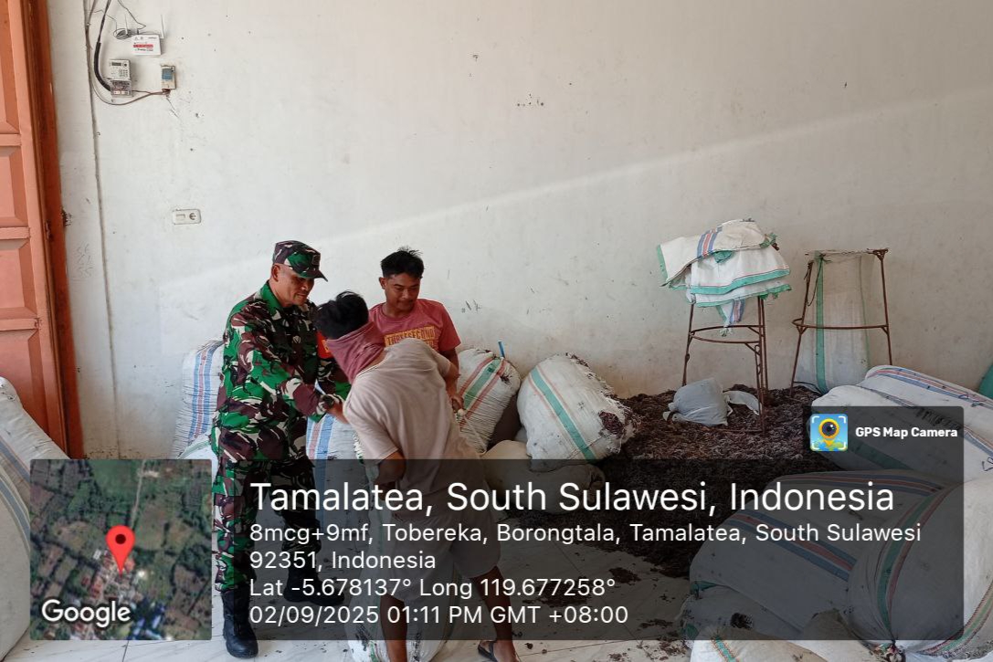Jeneponto, Aliefmedia.co.id – Babinsa Koramil 03/Tamalatea Kodim 1425/Jeneponto, Serda Ramli melaksanakan kegiatan komunikasi sosial (Komsos) bersama warga yang sedang bekerja mengolah rumput laut di Desa Bontosunggu, Kecamatan Tamalatea, Kabupaten Jeneponto. Selasa, 02/09/2025.