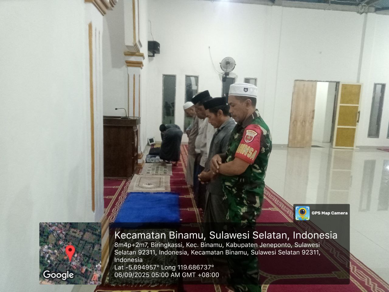 Jeneponto, Aliefmedia.co.id – Babinsa Koramil 01/Binamu Kodim 1425/Jeneponto, Sertu Sahrir T, melaksanakan ibadah sholat Subuh berjamaah bersama masyarakat di Masjid Al Ikhlas, Lingkungan Pattontongang, Kelurahan Biringkassi, Kecamatan Binamu, Kabupaten Jeneponto. Sabtu, 06/09/2025