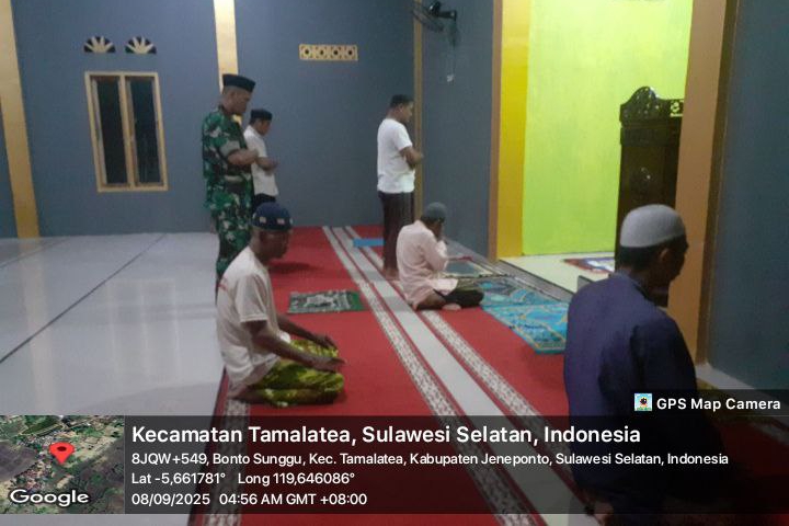 Jeneponto, Aliefmedia.co.id – Babinsa Koramil 03/Tamalatea Kodim 1425/Jeneponto, Serda Ramli, kembali hadir di tengah masyarakat binaannya melalui kegiatan ibadah sholat Subuh berjamaah. Kegiatan kali ini berlangsung di Masjid Nur Rahmat, Desa Bontosunggu, Kecamatan Tamalatea, Kabupaten Jeneponto. Senin, 08/09/2025.