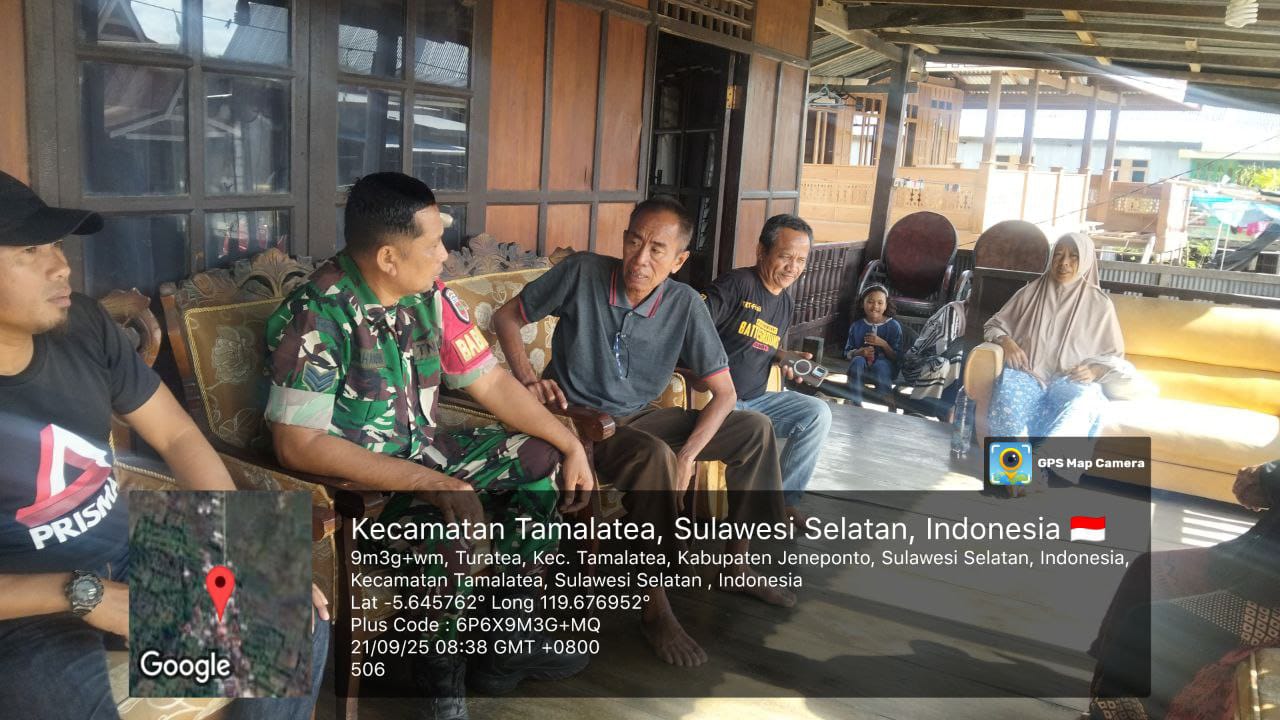 Mengetahui hal tersebut, Babinsa Koramil 03/Tamalatea Kodim 1425/Jeneponto, Serka Sahabuddin, segera bersilaturahmi ke rumah keluarga almarhum di Dusun Barandasi, Minggu, 21/09/2025.