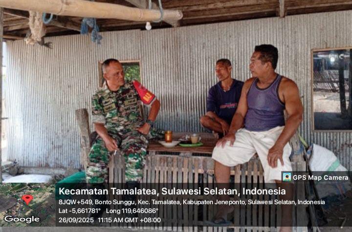 Jeneponto, Aliefmedia.co.id – Dalam rangka memperkuat kemanunggalan TNI dengan rakyat, Babinsa Koramil 03/Tamalatea Kodim 1425/Jeneponto, Serda Ramli melaksanakan kegiatan Komunikasi Sosial (Komsos) bersama warga binaannya di Desa Bontosunggu, Kecamatan Tamalatea, Kabupaten Jeneponto, Jum’at, 26/09/2025.