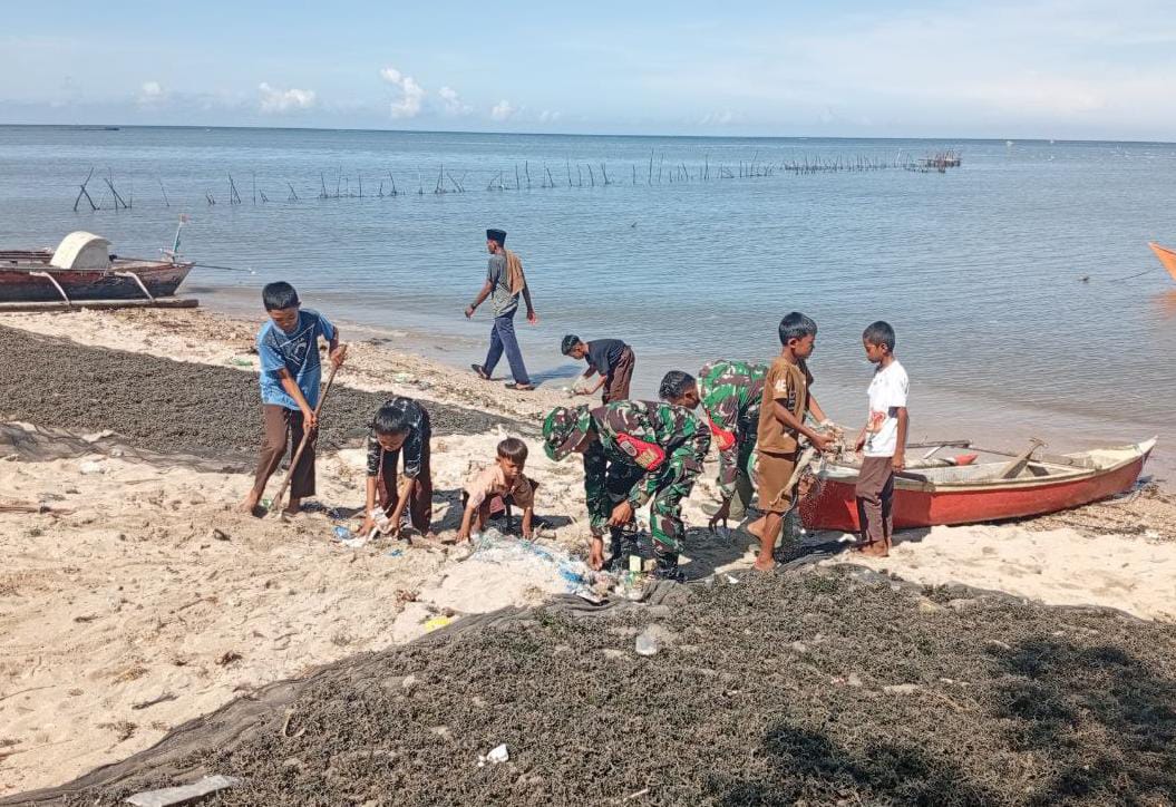 Dengan membawa peralatan sederhana, Babinsa bersama warga dan anak-anak bahu membahu mengumpulkan sampah plastik, ranting, serta material lain yang berserakan di bibir pantai.