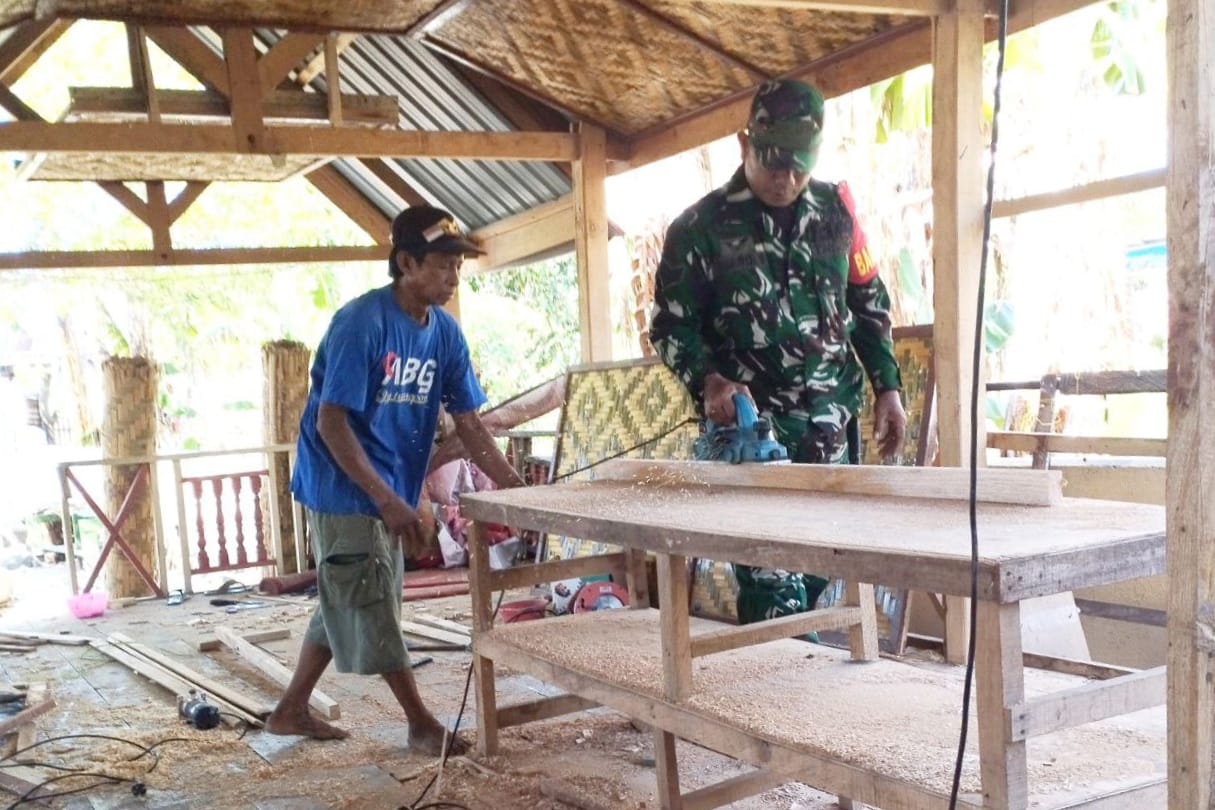 Dengan penuh semangat, warga dan Babinsa saling bahu membahu, ada yang memotong kayu, merakit meja, hingga membersihkan sisa serbuk gergaji.