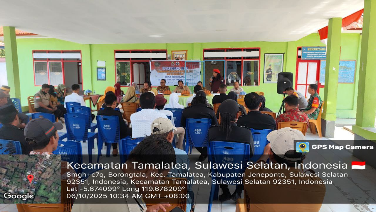 Kegiatan ini berlangsung di Kantor Desa Borong Tala, Kecamatan Tamalatea, Kabupaten Jeneponto, dengan dihadiri perangkat desa, BPD, tokoh masyarakat, tokoh pemuda, serta unsur kelembagaan desa.