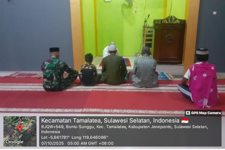 Jeneponto, Aliefmedia.co.id – Babinsa Koramil 03/Tamalatea Kodim 1425/Jeneponto, Serda Ramli, melaksanakan ibadah sholat Subuh berjamaah bersama masyarakat di Masjid Nurul Afsah Desa Bontosunggu, Kecamatan Tamalatea, Kabupaten Jeneponto. Selasa, 07 Oktober 2025.