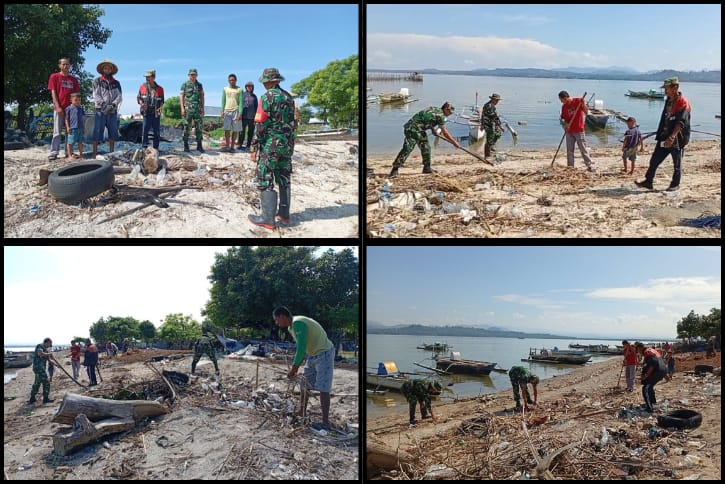 Dengan memanfaatkan alat sederhana, Babinsa bersama warga mengumpulkan sampah plastik, ranting, dan berbagai material yang berserakan di tepi pantai.