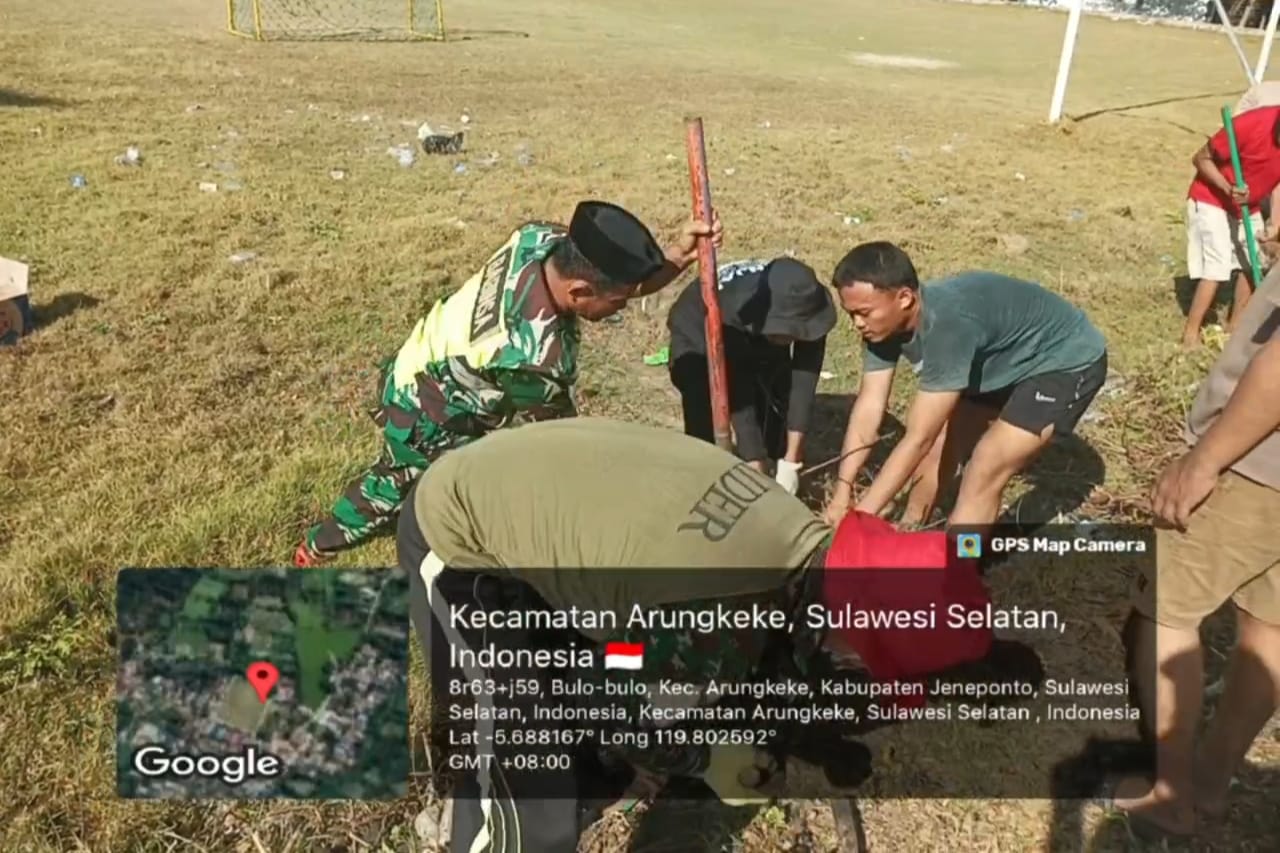 Jeneponto, Aliefmedia.co.id – Dalam semangat kebersamaan dan kepedulian terhadap kemajuan olahraga di desa binaannya, Babinsa Koramil 05/Batang Kodim 1425/Jeneponto, Serka Saharuddin bersama Kepala Desa Bulo-bulo dan para Kepala Dusun, bergotong royong menyiapkan Lapangan Sepak Bola Bambu Hijau yang akan menjadi lokasi pelaksanaan Turnamen Sepakbola Bulo-bulo Cup II.