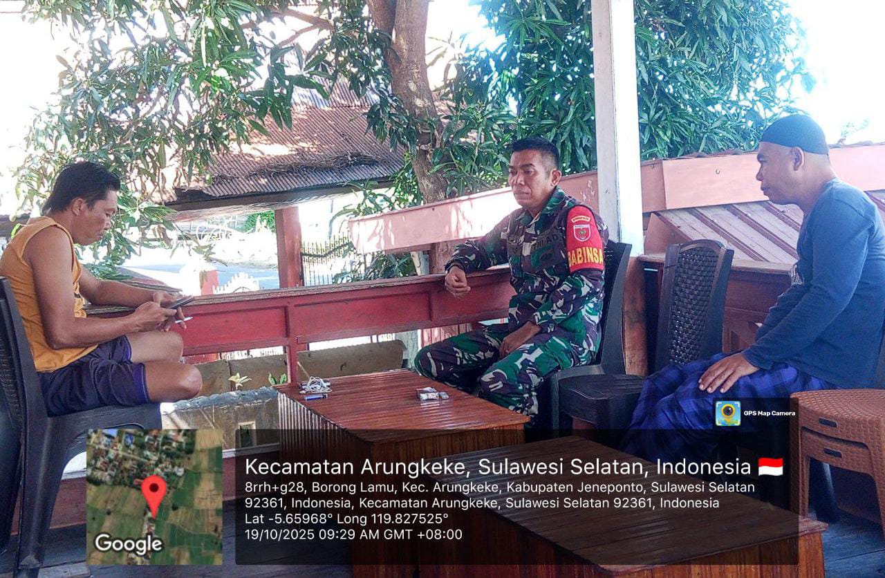 Jeneponto, Aliefmedia.co.id – Meski di hari libur, semangat pengabdian Babinsa Kodim 1425/Jeneponto tak pernah surut. Di tengah waktu istirahat masyarakat, Babinsa tetap hadir di wilayah binaannya untuk melaksanakan kegiatan komunikasi sosial (komsos) bersama warga, Minggu, 19/10/2025.