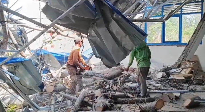Pohon tersebut kemudian menimpa dua ruang kelas yang sedang tidak digunakan.