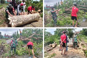 Dengan langkah cepat dan respons tanggap, ia segera bergabung bersama warga untuk menyingkirkan batang pohon yang menutup jalan. Suara gergaji manual, cabang pohon patah, dan arahan singkat membuat suasana gotong royong terasa hangat di tengah kondisi cuaca yang masih belum bersahabat.