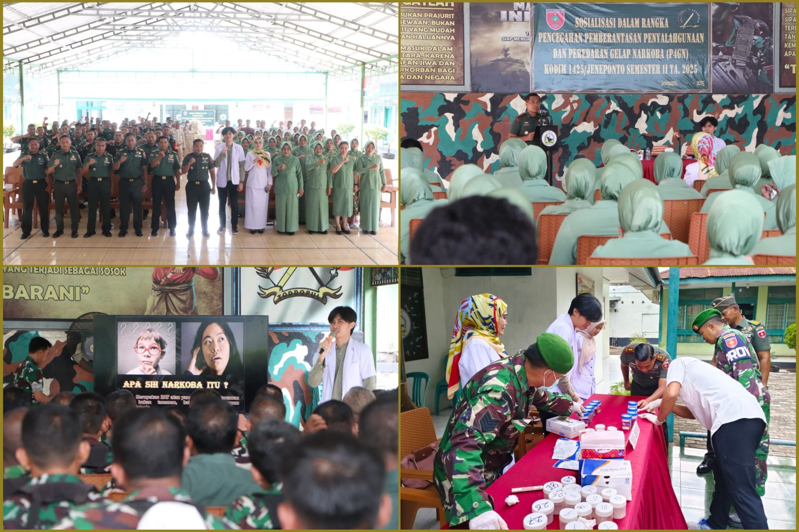 kegiatan diawali dengan pelaksanaan tes urine kepada seluruh prajurit dan PNS Kodim 1425/Jeneponto serta personel Kanminvetcad XIV-19/Hasanuddin.