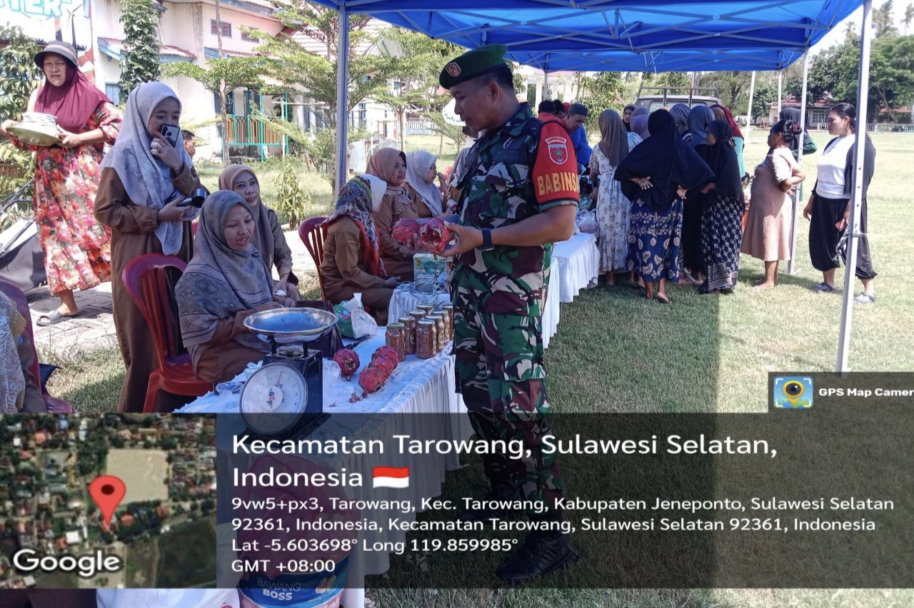 Jeneponto, Aliefmedia.co.id – Babinsa Koramil 05/Batang Kodim 1425/Jeneponto, Sertu Harianto, hadir memantau pelaksanaan Gerakan Pangan Murah (GPM) yang digelar oleh Dinas Hanpangan Provinsi Sulawesi Selatan bekerjasama dengan Dinas Hanpangan Kabupaten Jeneponto, di Desa Tarowang, Kecamatan Tarowang, Selasa, 25/11/2025.