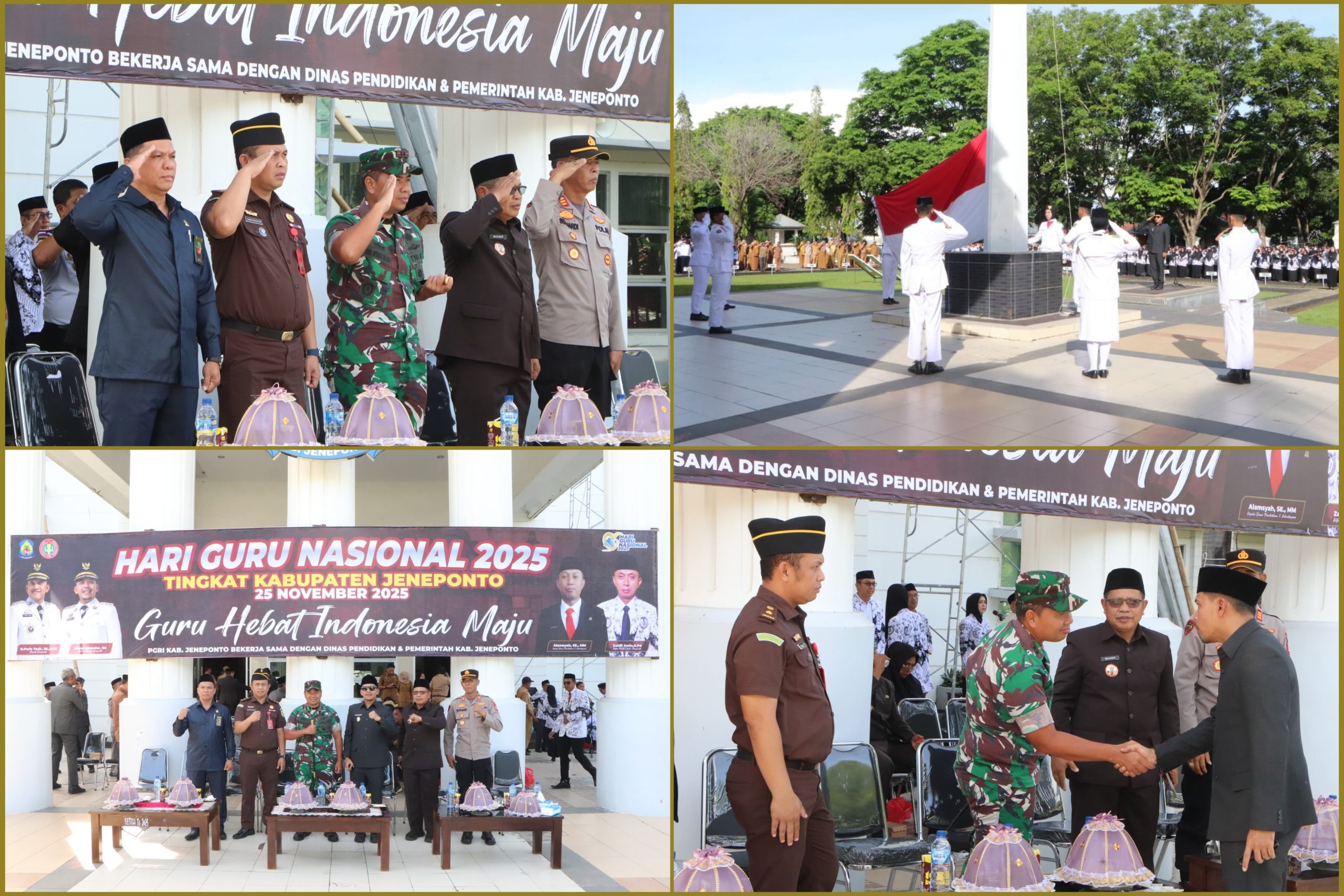 Jeneponto, Aliefmedia.co.id – Dandim 1425/Jeneponto, Letkol Inf Abdul Muthalib Tallasa, menghadiri upacara bendera peringatan Hari Guru Nasional 2025 dengan tema “Guru Hebat, Indonesia Maju” yang digelar di halaman Kantor Bupati Jeneponto, Selasa, 25/11/2025.