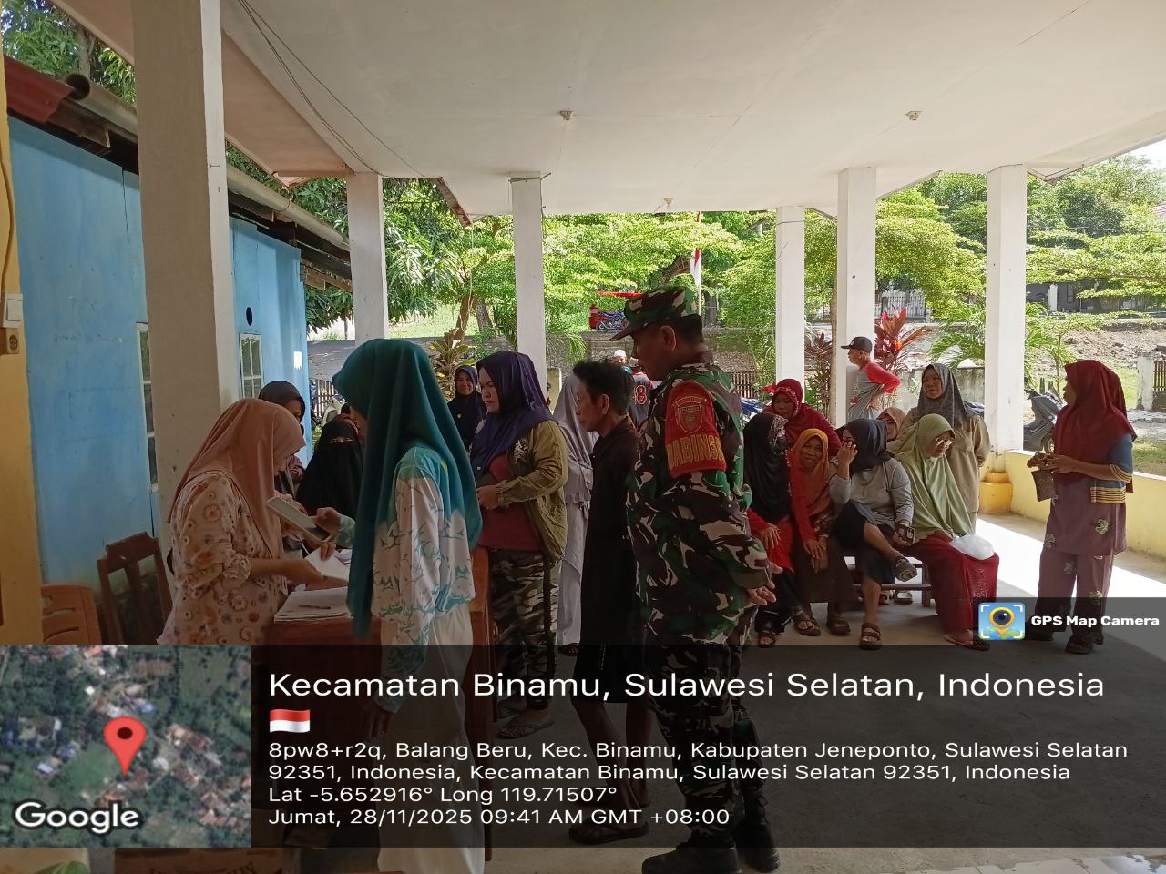 Jeneponto, Aliefmedia.co.id – Babinsa Koramil 01/Binamu Kodim 1425/Jeneponto, Serda Jaya Ambo, turut hadir mendampingi sekaligus memantau proses penyaluran Bantuan Pangan Beras dan minyak goreng kepada warga binaannya di Kantor Kelurahan Balang Beru, Kecamatan Binamu, Kabupaten Jeneponto, Jumat, 28/11/2025.