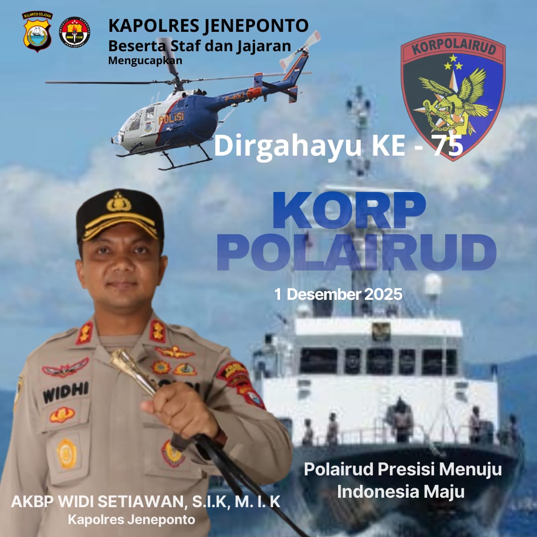 Jeneponto – Polisi Perairan dan Udara (Korpolairud) Polri genap berusia 75 tahun pada Senin, 1 Desember 2025. Momentum spesial ini dirayakan dengan penuh khidmat, salah satunya dengan ucapan selamat yang disampaikan langsung oleh Kapolres Jeneponto, AKBP Widi Setiawan, S.I.K., M.I.K.
