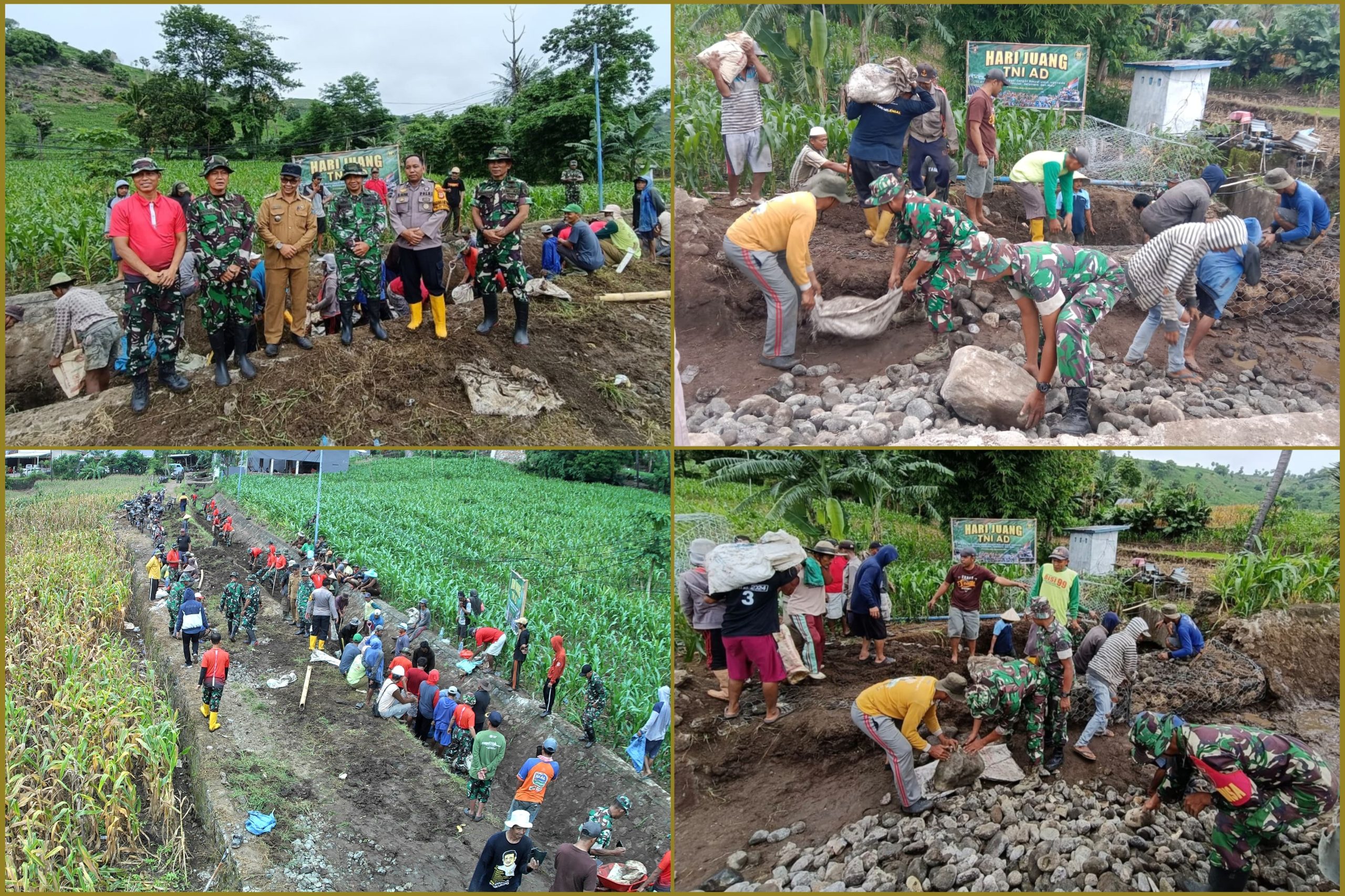 Kegiatan ini menyasar pembersihan dan perbaikan tanggul irigasi pertanian yang menjadi nadi kehidupan para petani setempat. Sejak pagi, Prajurit TNI, aparat desa, dan warga bergotong royong menunjukkan semangat kebersamaan yang kuat, mencerminkan nilai-nilai pengabdian TNI kepada rakyat.