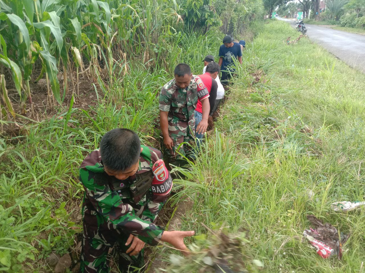 Dengan penuh semangat gotong royong, Babinsa dan warga membersihkan saluran air dari sampah, endapan lumpur, serta rumput liar yang berpotensi menghambat aliran air.