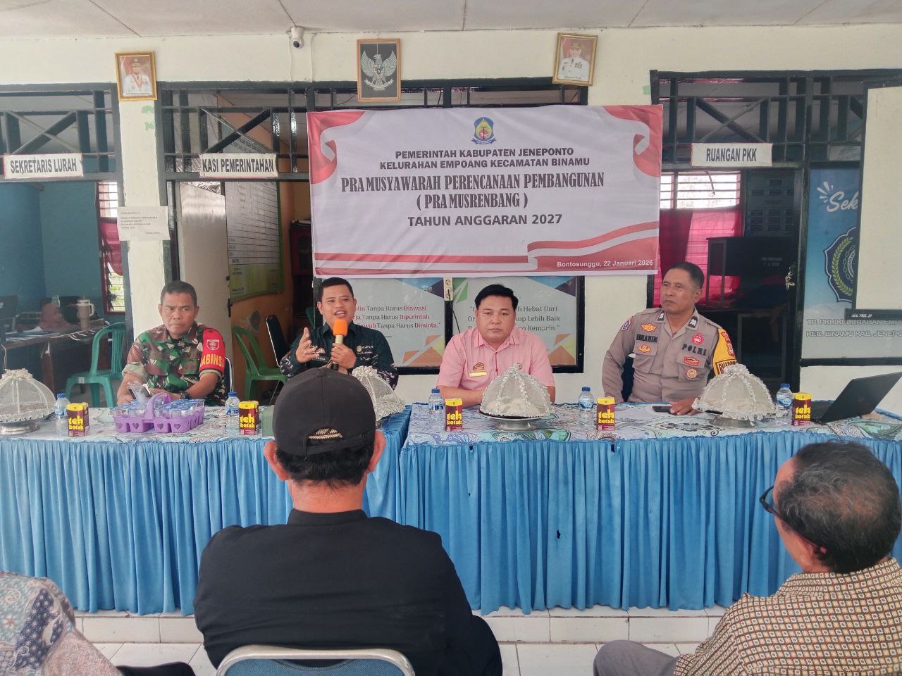 Jeneponto, Aliefmedia.co.id – Babinsa Koramil 01/Binamu Kodim 1425/Jeneponto, Serda Agus Salim, menghadiri kegiatan Pra Musyawarah Perencanaan Pembangunan (Pra Musrenbang) Tahun Anggaran 2027 yang berlangsung di Kantor Kelurahan Empoang, Kecamatan Binamu, Kabupaten Jeneponto, Kamis (22/1/2026).