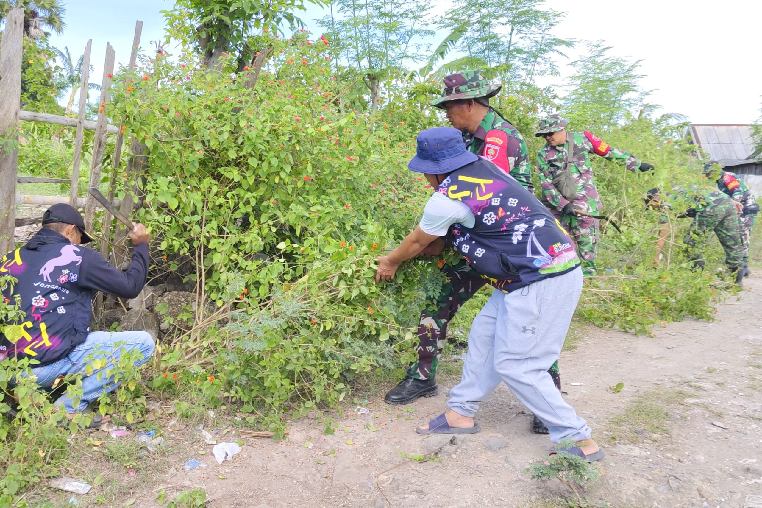 Jeneponto, Aliefmedia.co.id – Personel Koramil 05/Batang Kodim 1425/Jeneponto bersama warga masyarakat melaksanakan kegiatan gotong royong pembersihan kiri dan kanan jalan menuju lokasi Koperasi Merah Putih di Desa Bungeng, Kecamatan Batang, Kabupaten Jeneponto, Jumat (30/1/2026).