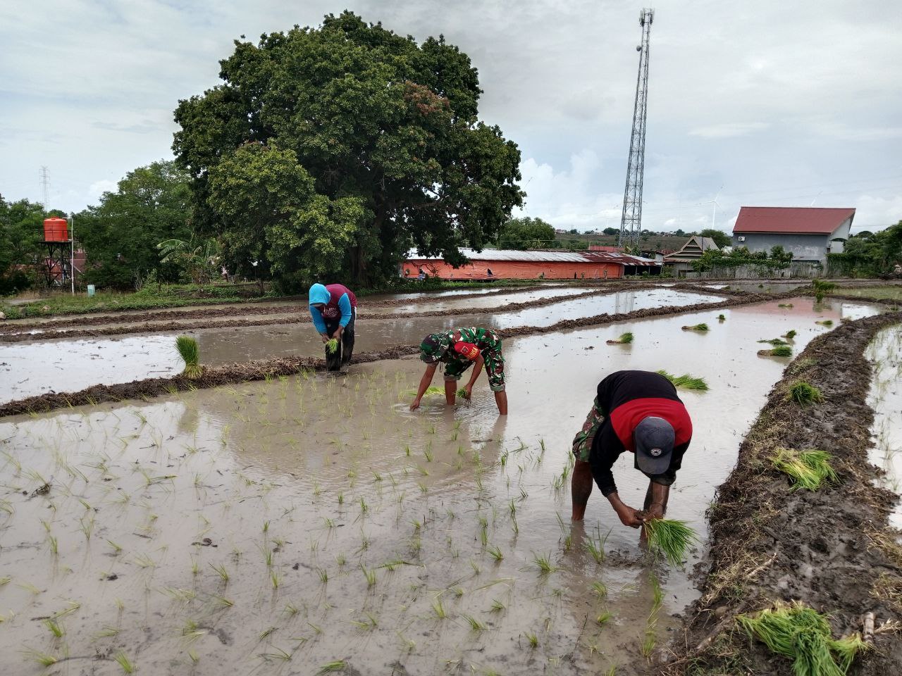 Kegiatan tanam padi ini dilakukan secara manual dengan melibatkan petani setempat, di mana Babinsa turut berbaur di tengah sawah untuk memastikan proses tanam berjalan rapi dan sesuai pola tanam.