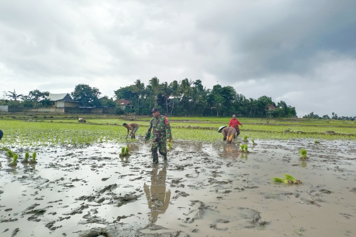 Kegiatan tanam padi tersebut dilakukan secara gotong royong bersama petani setempat. Kehadiran Babinsa di tengah sawah tidak hanya mempercepat proses penanaman, tetapi juga memastikan pola tanam dilakukan secara rapi dan seragam, sehingga diharapkan mampu mendukung pertumbuhan tanaman padi yang optimal.