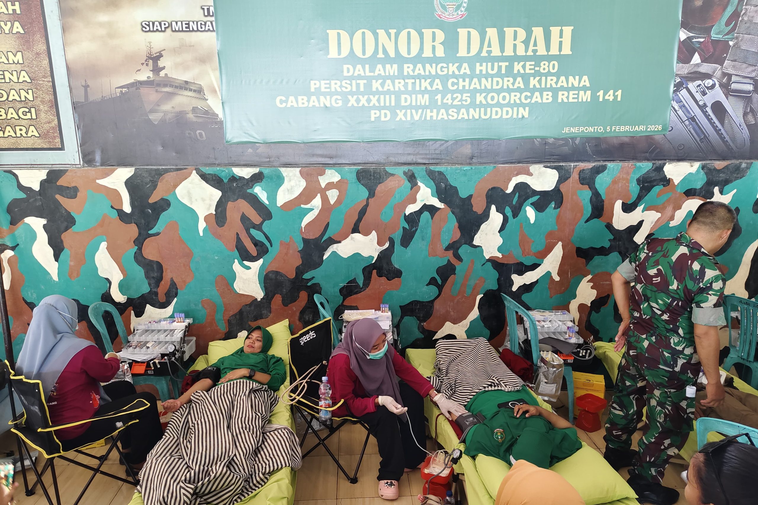 Berkolaborasi dengan Polkes Kodim 1425/Jeneponto, UPT RSUD Lanto Daeng Pasewang, serta UPT Puskesmas Bontosunggu Kota, Persit menggelar Bakti Sosial berupa donor darah dan pemeriksaan kesehatan gratis yang berlangsung di Aula Vyati Makodim 1425/Jeneponto, Kamis, 5/2/2026.