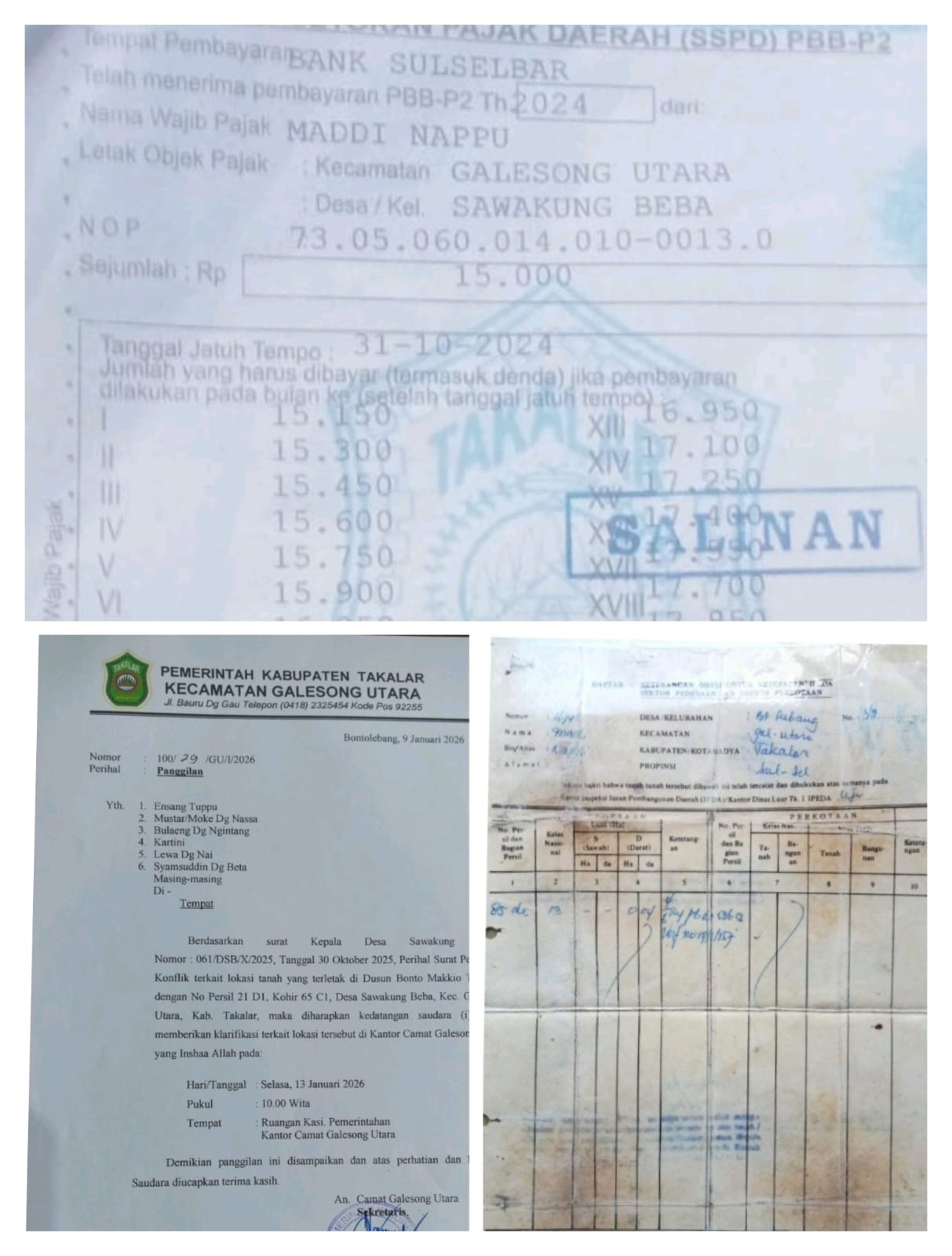 Berdasarkan Surat Pemdes Sawakung Beba Nomor 061/DSB/X/2025 tanggal 30 Oktober 2025, pihak kecamatan telah memanggil lima nama untuk dimintai keterangan, sebagaimana surat Kasi Pemerintahan Kecamatan Galesong Utara Nomor 100/29/GU/I/2026 tanggal 9 Januari 2026.