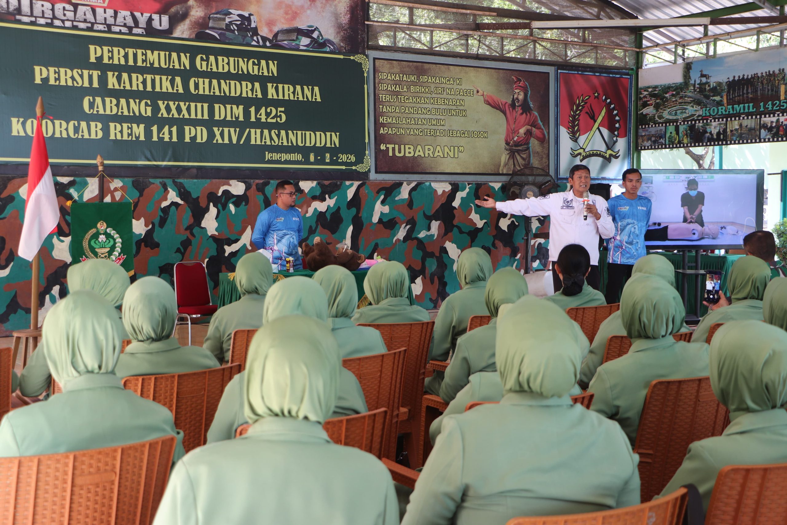 Jeneponto, Aliefmedia.co.id – Usai pelaksanaan pertemuan gabungan, Persit Kartika Chandra Kirana (KCK) Cabang XXXIII Dim 1425 Koorcab Rem 141 PD XIV/Hasanuddin kembali melanjutkan rangkaian kegiatan dengan menggelar Penyuluhan Keselamatan Jantung.