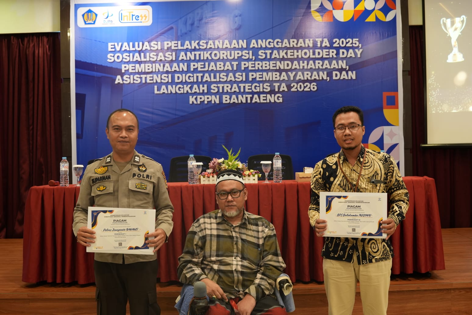 Penghargaan tersebut diterima oleh Aiptu Suparman perwakilan Polres Jeneponto yang hadir dalam kegiatan bertajuk “Evaluasi Pelaksanaan Anggaran TA. 2025, Sosialisasi Anti Korupsi, Stakeholder Day, Asistensi Digitalisasi Pembayaran, dan Langkah Strategis TA 2026” di Hotel Kirei Bantaeng, Kamis (5/2/2026) lalu.