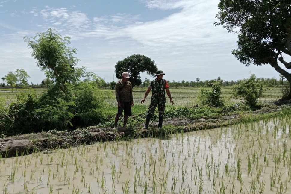 Di tengah genangan air sawah dan terik matahari, Serda Jufri tampak berdiskusi sembari mengecek kondisi pertumbuhan padi yang mulai memasuki fase awal pertumbuhan.