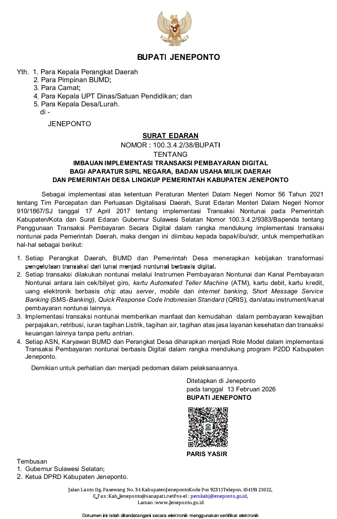 Bupati Jeneponto, H. Paris Yasir, SE., MM., resmi menerbitkan Surat Edaran tentang Imbauan Implementasi Transaksi Pembayaran Digital bagi Aparatur Sipil Negara, Badan Usaha Milik Daerah, dan Pemerintah Desa Lingkup Pemerintah Kabupaten Jeneponto.