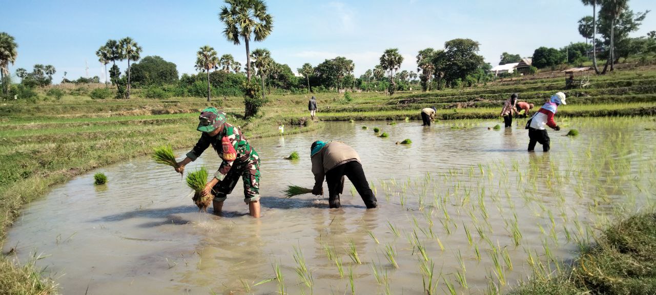 Di tengah genangan air dan lumpur, Sertu Jamaluddin bersama para petani menanam bibit padi secara teratur mengikuti pola tanam yang rapi.