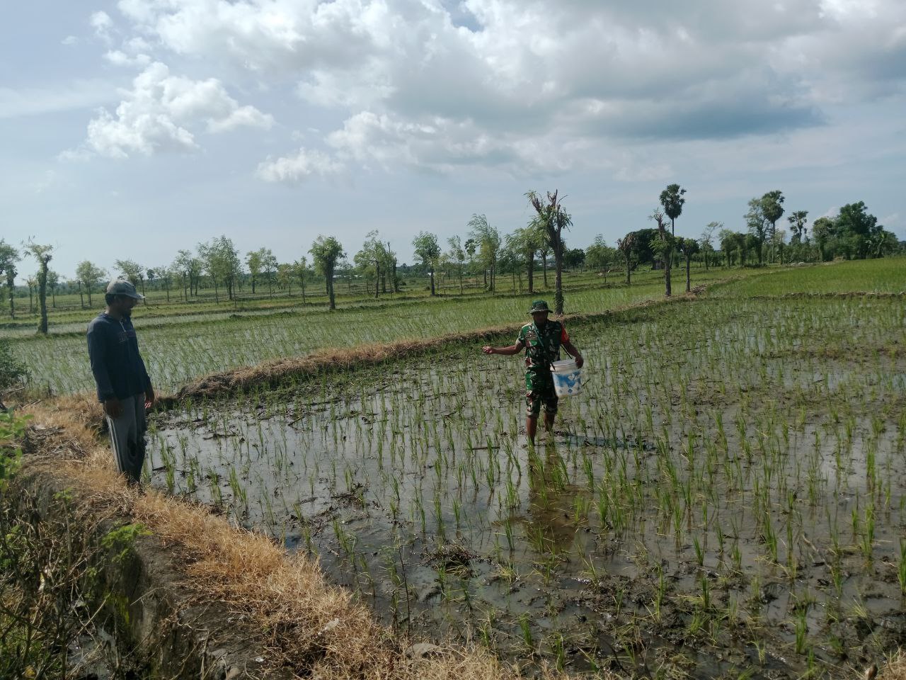 Bukan sekadar memantau, Serda Jufri menyusuri petakan sawah yang berlumpur sambil menaburkan pupuk secara merata.