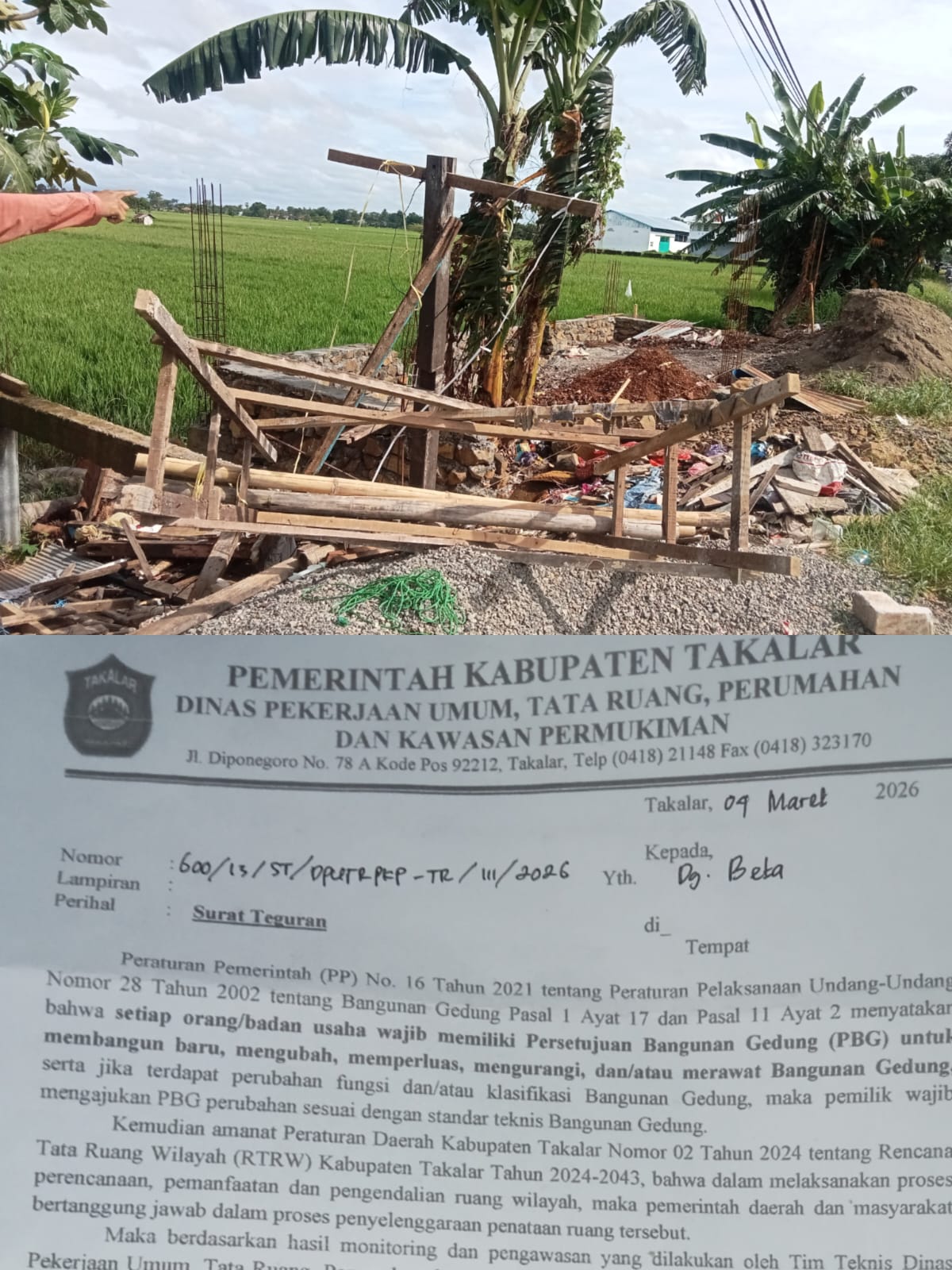 Namun, yang datang justru surat teguran resmi terkait kewajiban Persetujuan Bangunan Gedung (PBG) dari dinas teknis dengan nomor: 600/13/ST/DPURT PKP-TR/III/2026.
