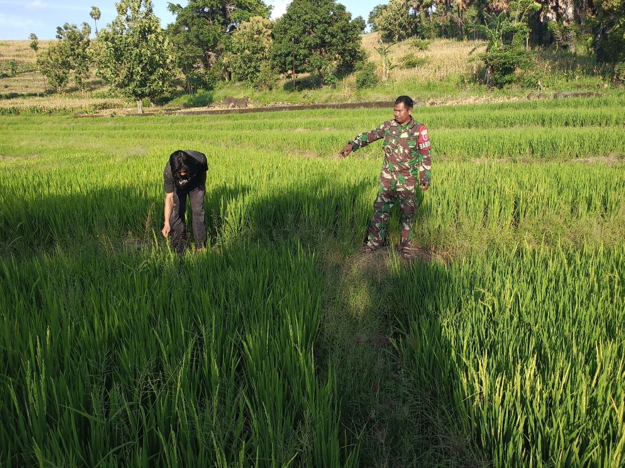 Babinsa bersama petani secara langsung mengamati daun, batang, hingga kondisi tanah, guna mendeteksi kemungkinan gangguan sejak dini.