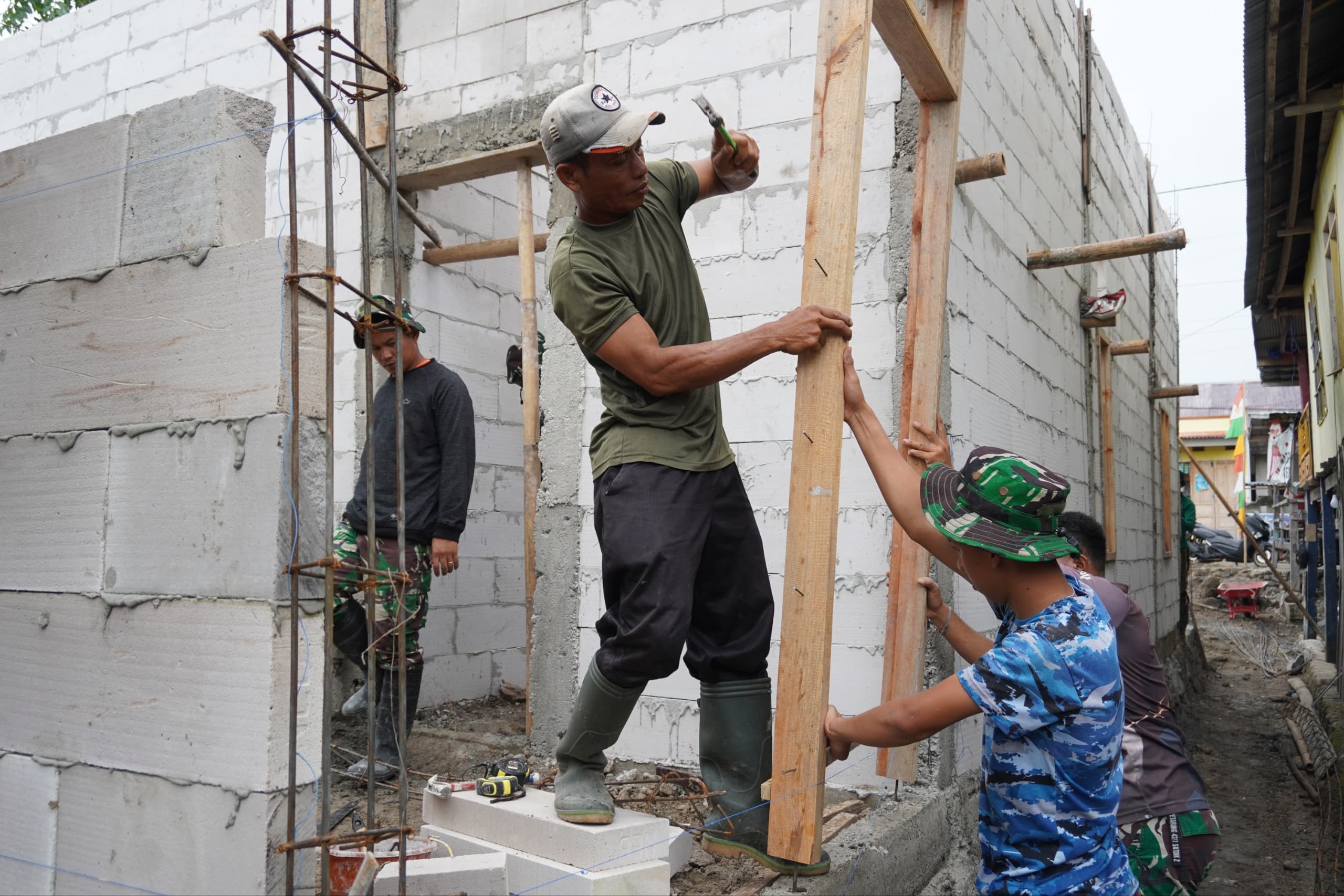 Memasuki progres sekitar 45 persen, personel Satgas bersama warga tampak teliti menata bagian demi bagian bangunan, memastikan setiap sisi berdiri kuat dan selaras.